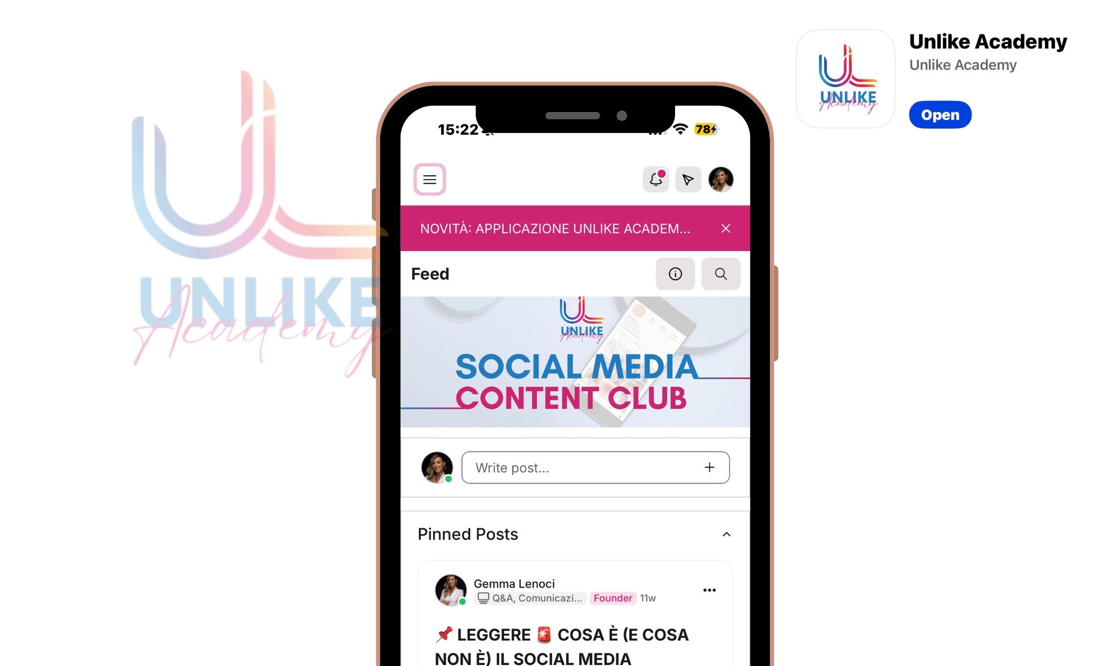Per prima cosa, se ancora non l’hai fatto, scarica l’app UNLIKE ACADEMY e attiva le notifiche: avrai club e corsi all’interno della stessa app 📲